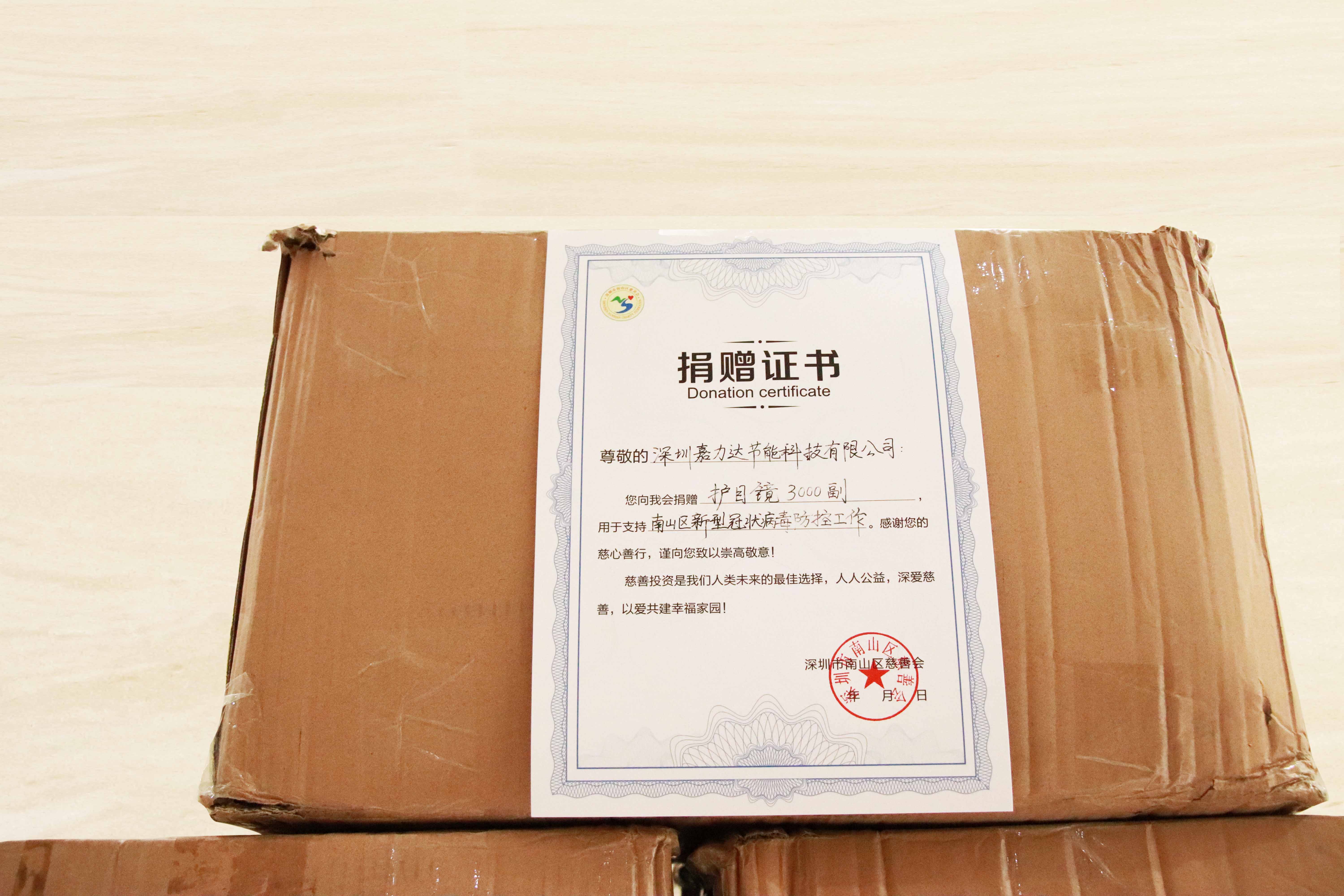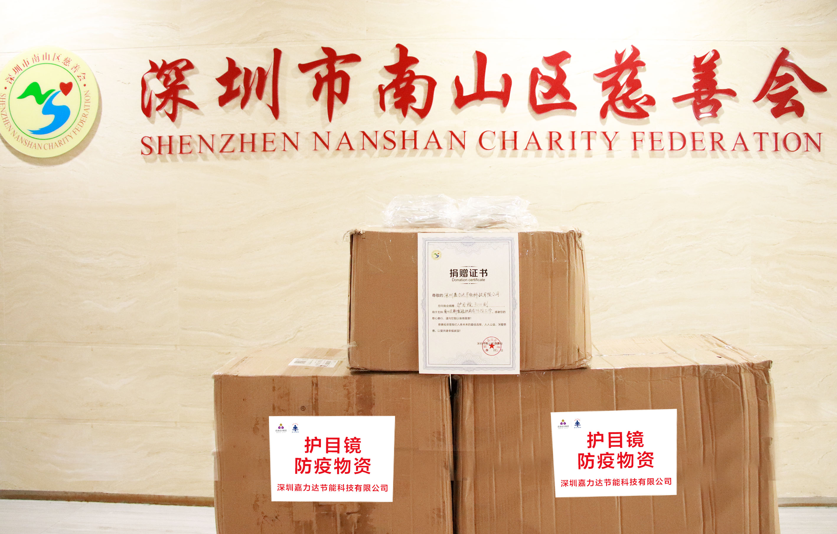 2月18日,嘉力达通过各种渠道,千方百计筹集到一批紧缺物资——护目镜,与深圳市南山区慈善会共同捐赠至一线防疫人员。