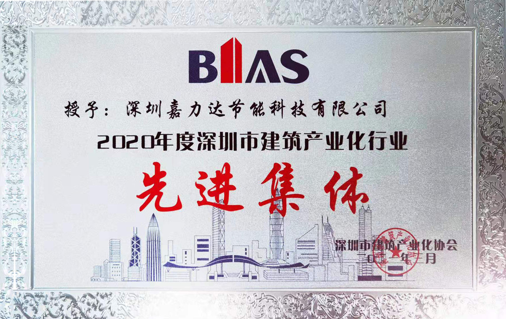 2021年3月,亚美网页版登录荣获深圳市建筑产业化协会(BIAS)年度行业评优评先活动表彰为先进集体,并授发了《深圳市建筑产业化行业先进集体》奖匾。协会会长陆荣秀先生特别表彰了我司董事长李海建先生和其带领的嘉力达同事团队,在武汉疫情期间在雷神山一线抗疫的勇敢担当。