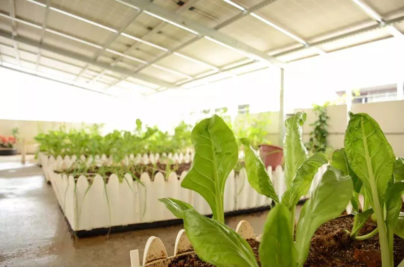 屋顶的太阳能板之下是小型蔬菜种植基地,它承载了屋顶绿化的作用:美观、防水、保温、隔热和生态环保,并且提供了新鲜的蔬菜来源。
