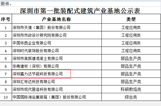7月8日,深圳市住房和建设局公示了深圳市第一批装配式建筑产业基地入选企业名单。共有10家企业入选,嘉力达荣幸成为其中一员。