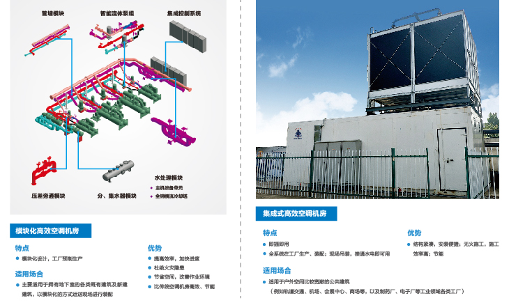 产品特点:分“模块化”和“集成式”两大类,采用模块化或者集成式方式在工厂进行预制,运行到现场进行装配,可大大缩短工期,节省占地面积,提高产品质量的同时可实现节能率达30%。