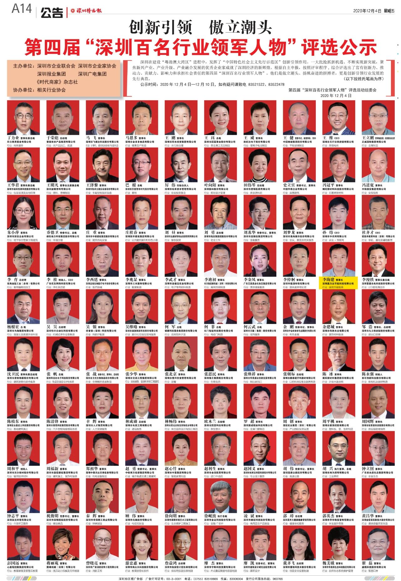 12月4日,第四届“深圳百名行业领军人物”评选名单出炉并于《深圳特区报》A14版公示,亚美网页版登录董事长李海建入选。